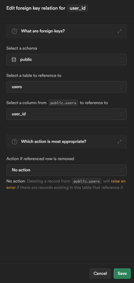 select a table to reference to에서 users테이블을 클릭한후 user_id를 외래키로 가져온후 save 해줍니다.