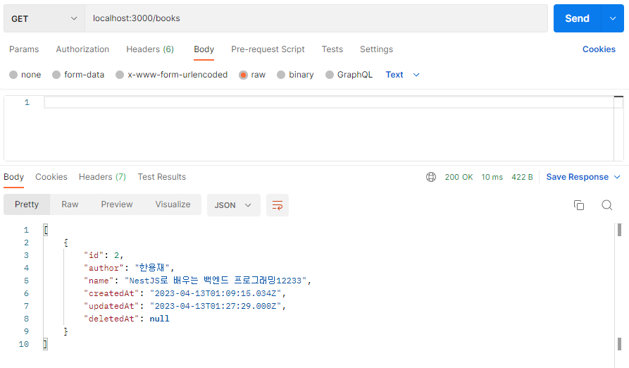 - @InjectRepository(BookEntity): BookEntity 엔티티를 사용하기 위해, booksRepository 멤버 변수에 TypeORM Repository 객체를 주입합니다. 이 객체는 데이터베이스 조작을 수행하기 위해 사용됩니다.