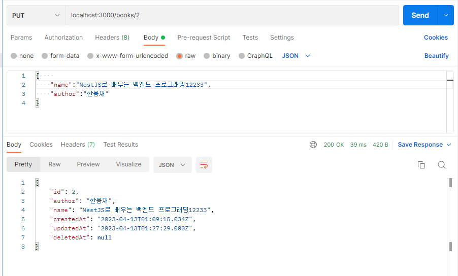 - async update(id: number, book: BookEntity): Promise<number>: booksRepository.update()를 사용하여 데이터베이스에서 특정한 책을 업데이트합니다.