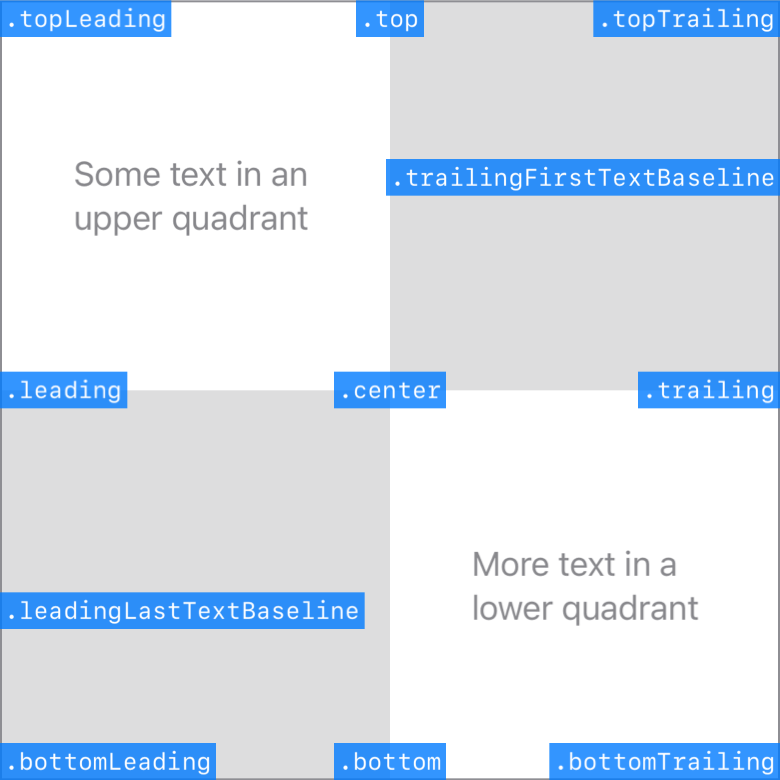 - .bottomTrailing: 하위 뷰를 컨테이너의 오른쪽 하단에 정렬합니다.