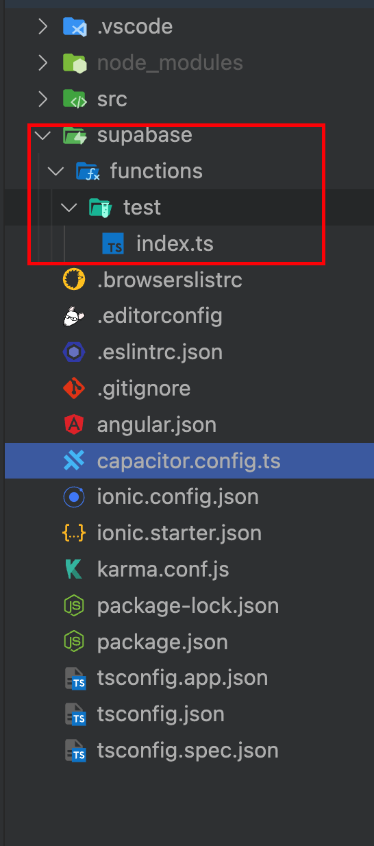 위와 같이 명령어를 입력하면 supabase 폴더가 만들어집니다. 진행하는 프론트엔드 프로젝트에 만들어줬습니다.