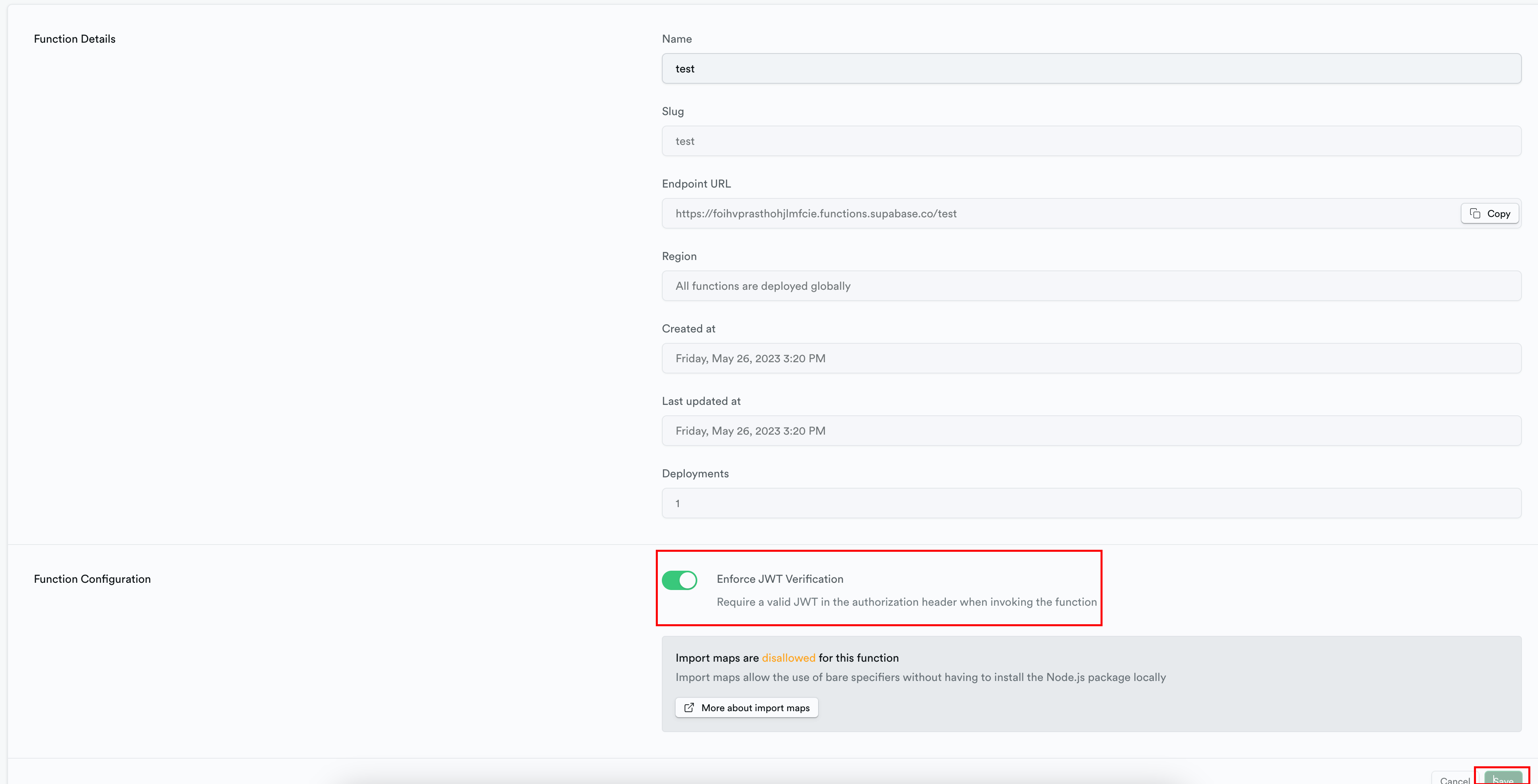 enforce jwt verification 이 기본 설정이 true이기 때문입니다 이것을 false로 바꾼후 save하고 다시 요청을 보내보면 아래와 같이 정상적으로 실행 되는것을 보실수 있습니다.