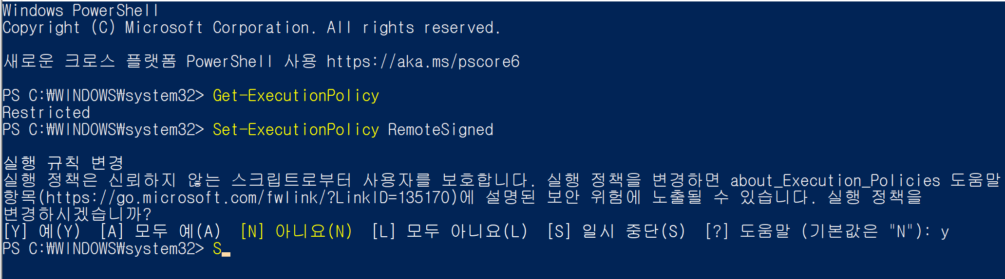아마 pwoershell의 기본값이 restricted로 설정되어 있기 때문인거같다