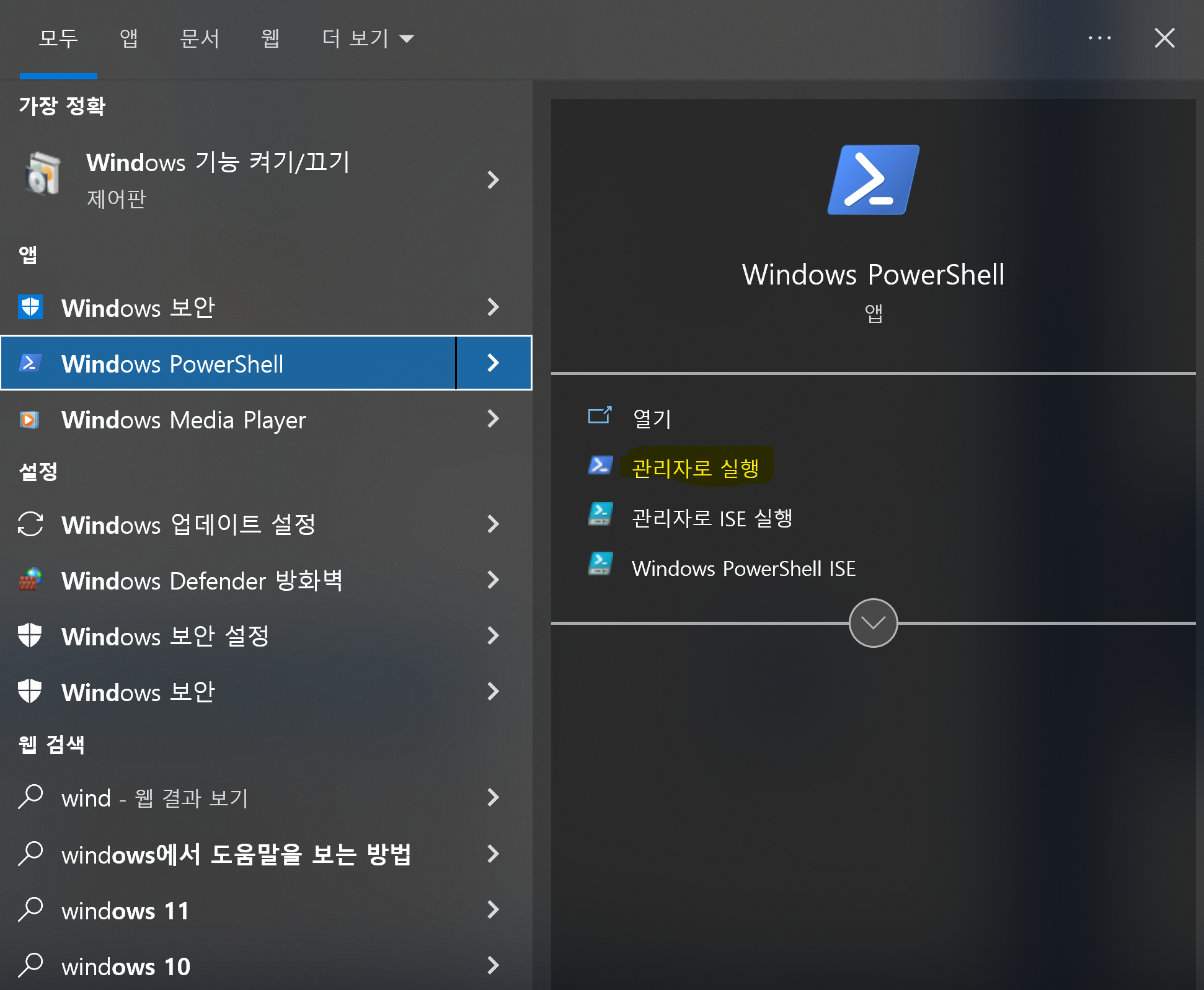 1. Window검색창에서 PowerShell을 찾아주고 관리자 권한으로 실행한다.
