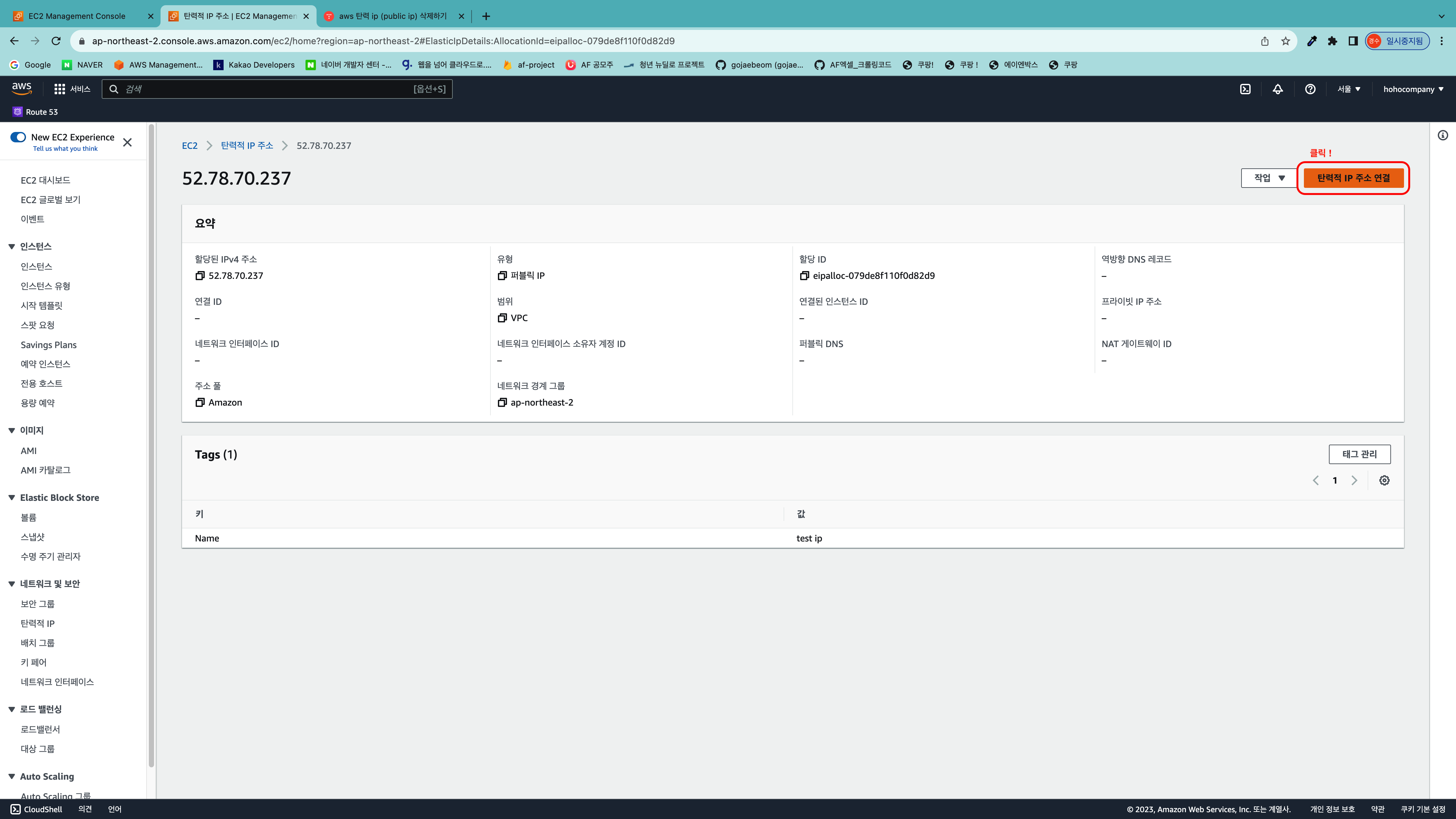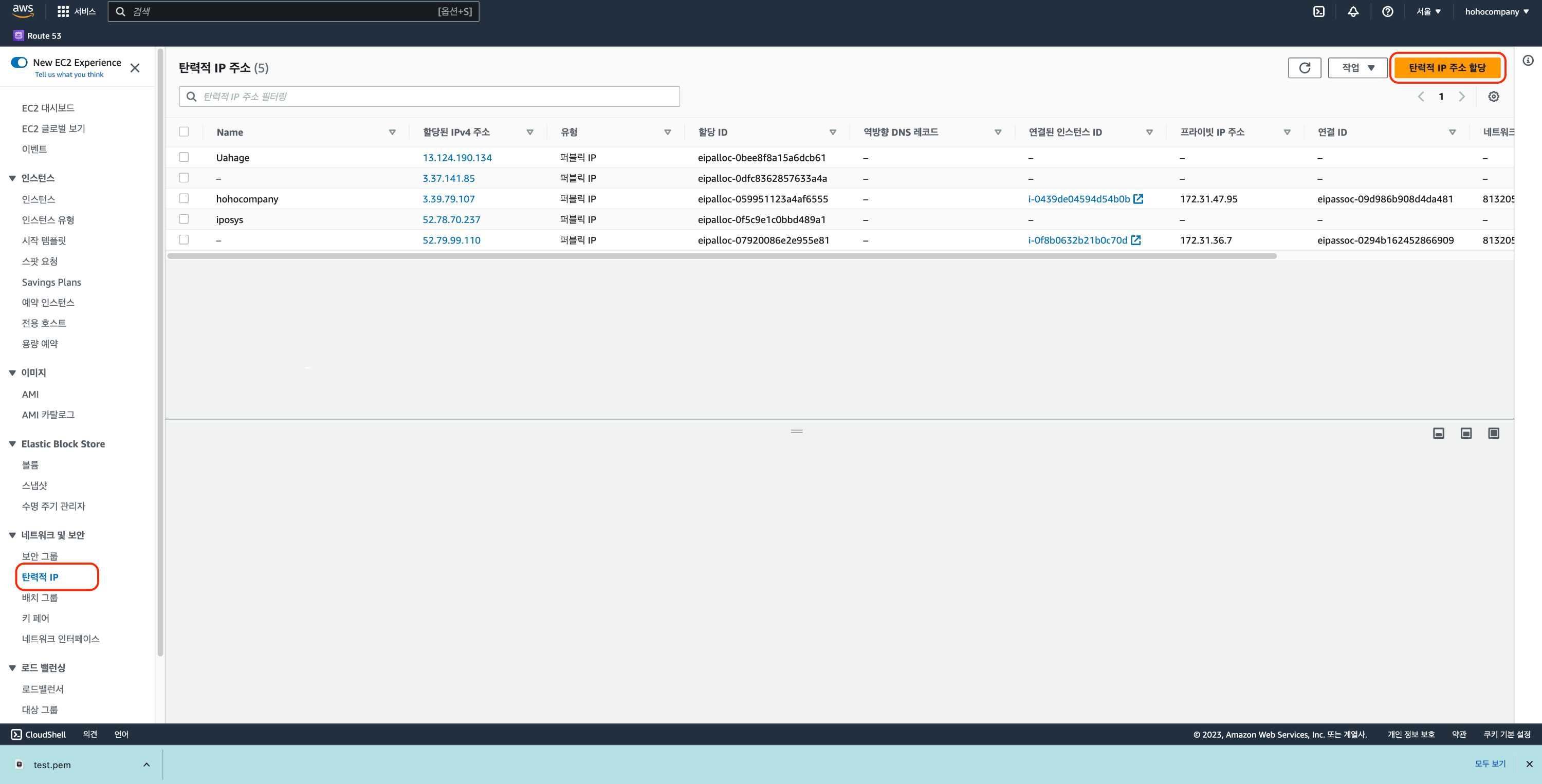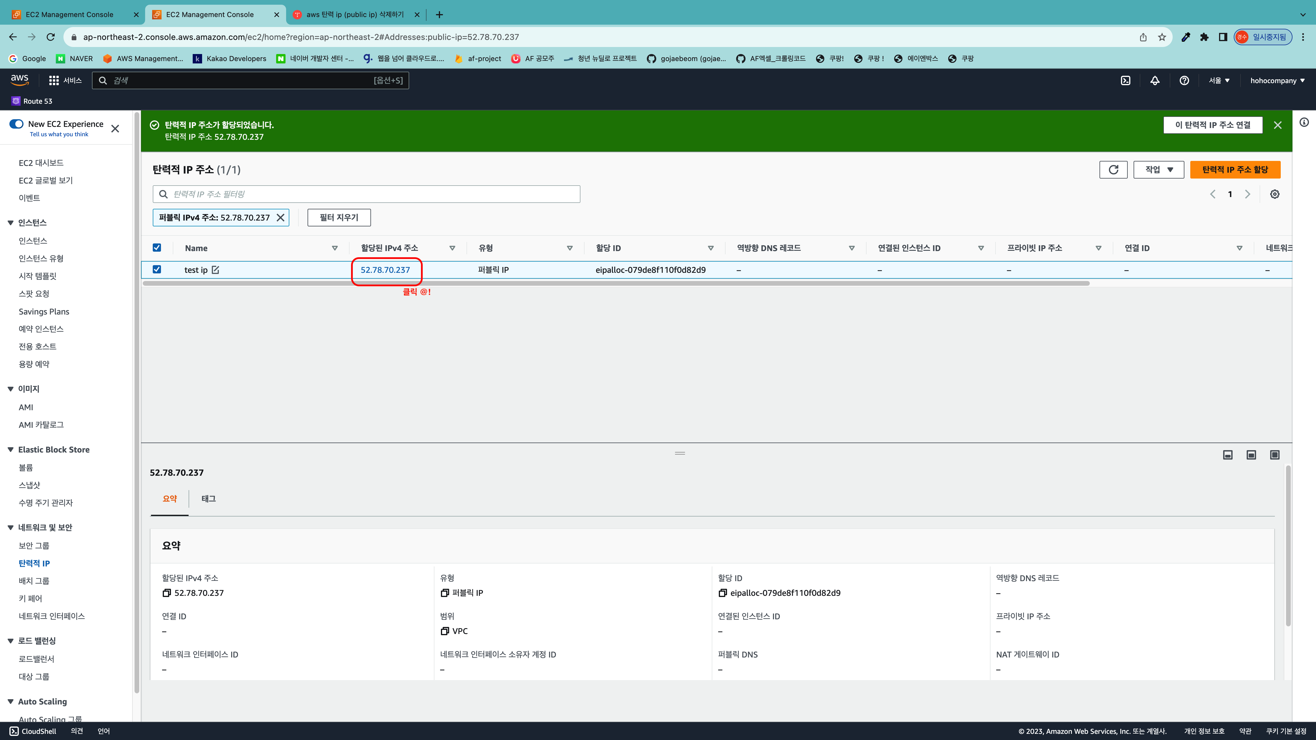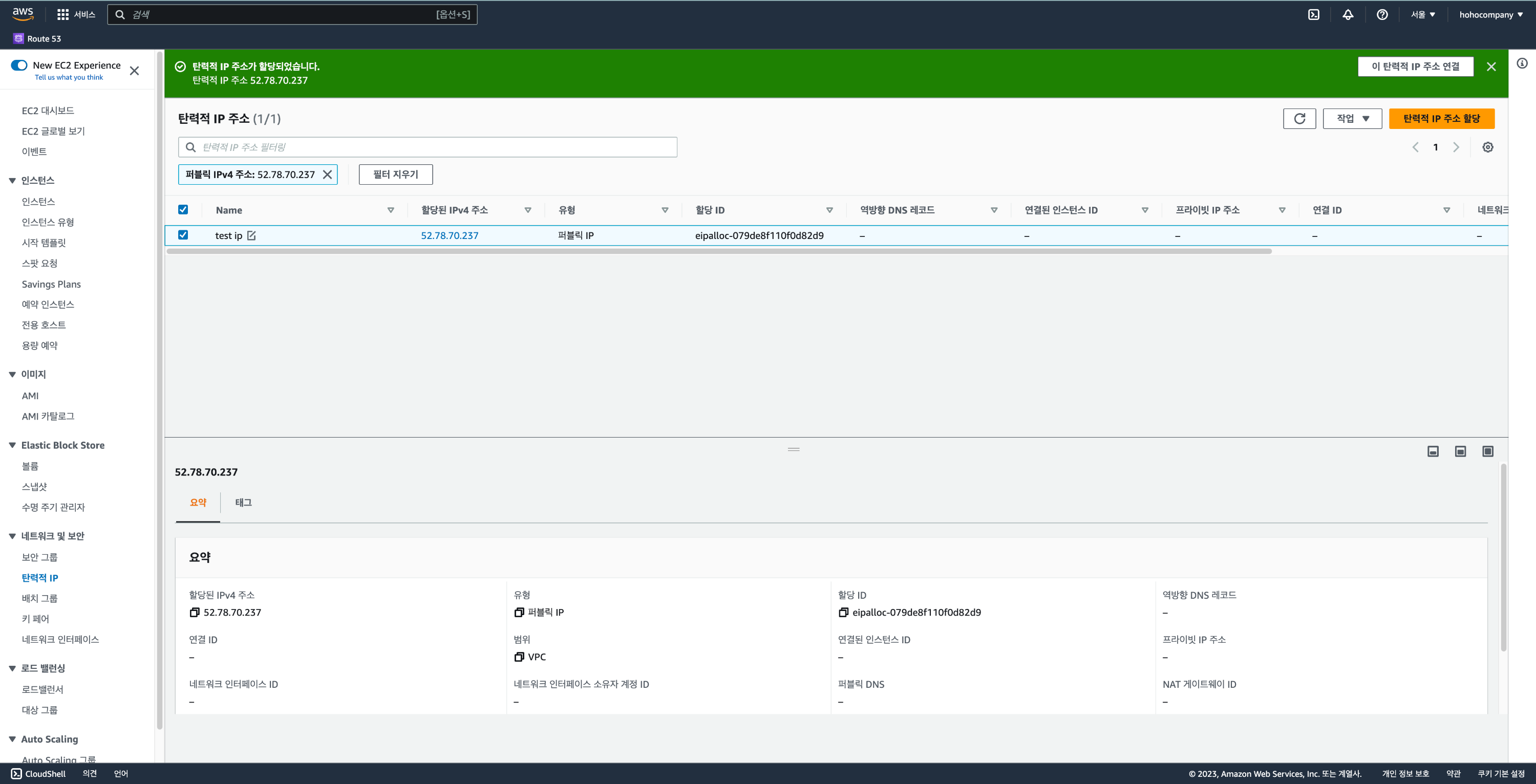 아래와 같이 탄력적 IP가 할당된 것을 볼수 있습니다.