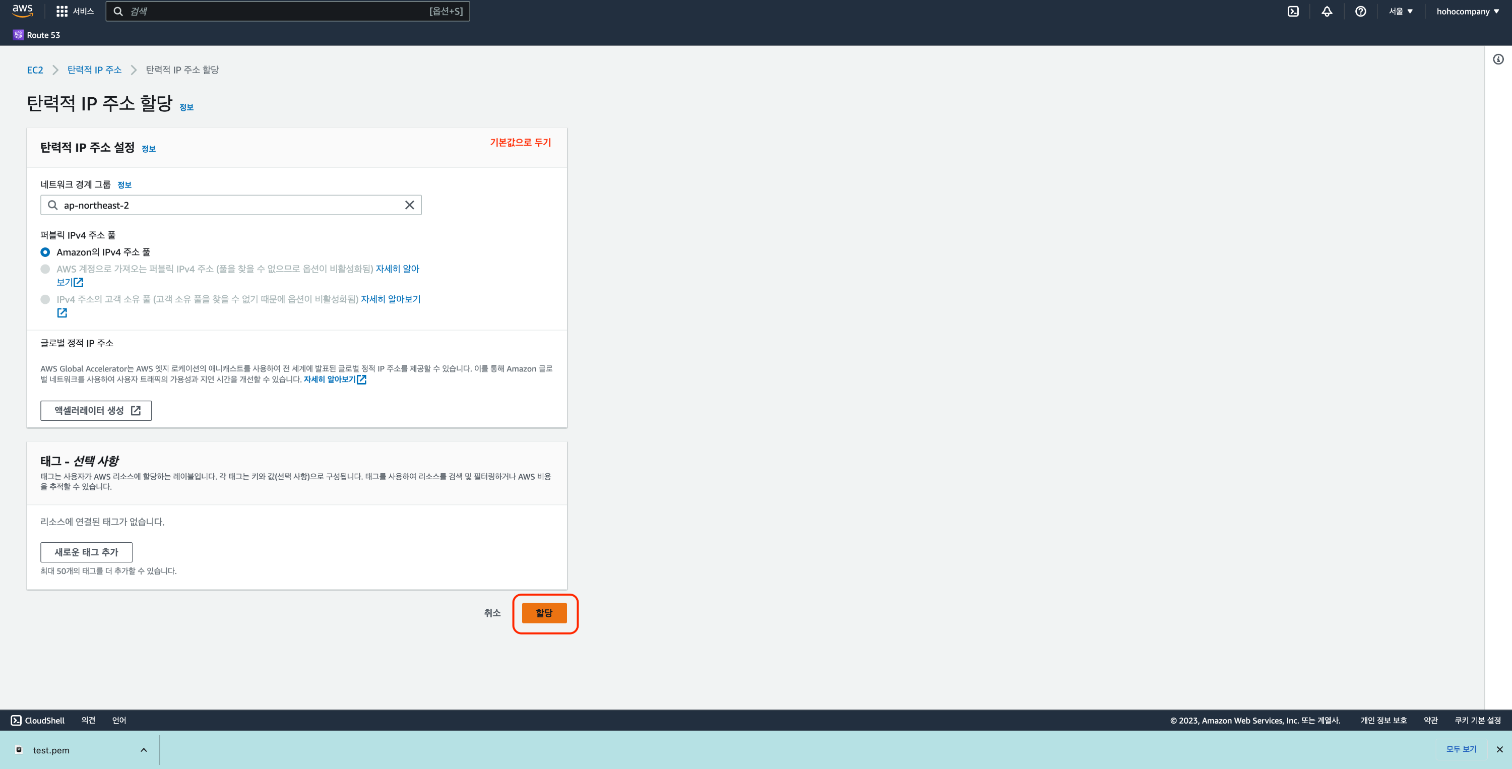 탄력적 IP 주소 할당을 클릭해주신후